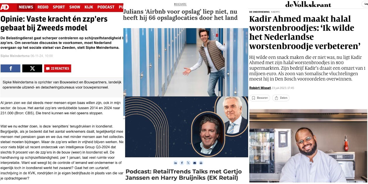 Daarbij puzzelen we veelvuldig: welk verhaal zou bij welk medium een mooi plekje kunnen krijgen? Vraag en aanbod moeten immers zo goed mogelijk matchen. Op die manier hebben we de levensverhalen van de onvolprezen halalkoning Kadir Ahmed van Kadir’s in de Volkskrant gekregen, stond Julian Doorten van Storage Share op de site van vakmedium De Ondernemer en werd Sipke Meindertsma van bouwbemiddelaar Bouwselect en Bouwpartners geportretteerd door Elsevier.