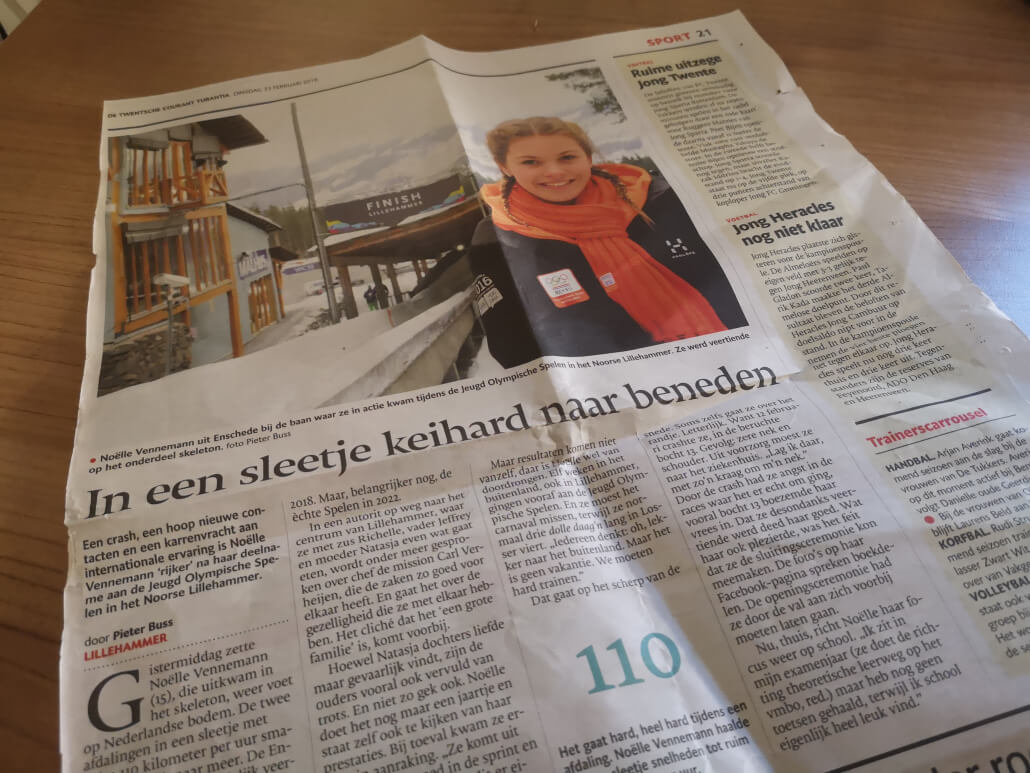 Op mijn vrije dag cruise ik met mijn kleine auto dwars door maagdelijk witte, glanzende sneeuwhopen naar Lillehammer. Alleen al die weg ernaartoe is ware topsport… Eenmaal bij de skeletonbaan tref ik haar al snel. Een ontwapenend gesprek met haar en haar ouders volgt. Ze mag dan een puber zijn, volwassen praat ze over haar ambities. Het verhaal dat kort na het weekend de kolommen van Tubantia haalt, levert veel reacties op. Niet alleen vanwege de avonturen van Noëlle, ook de sport skeleton heeft aan bekendheid gewonnen. En dat zou de jaren die volgden alleen maar groeien.